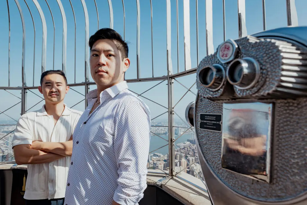 Plume's founders Chris Yin (right) and Teddy Pornprinya appear at the Empire State Building, which is also the site of their U.S. office's launch. Photo credit: Laila Stevens / The New York Times