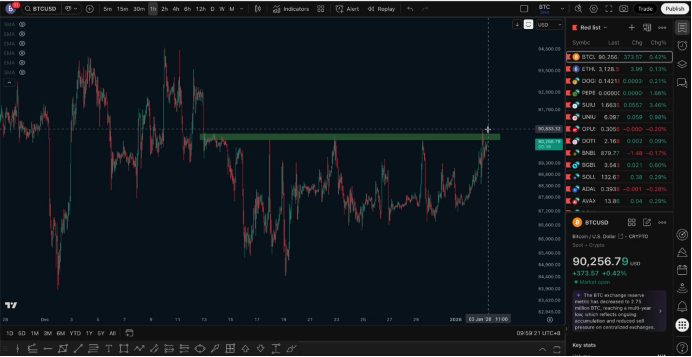 价格站稳90,000上方整理,并完成对91,000的有效突破。