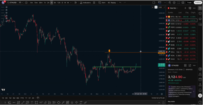 如果以太坊继续反弹并进入空头清算阶段,前方高点3,450附近大概率需要被测试,整体反弹目标可能接近3,500一线。