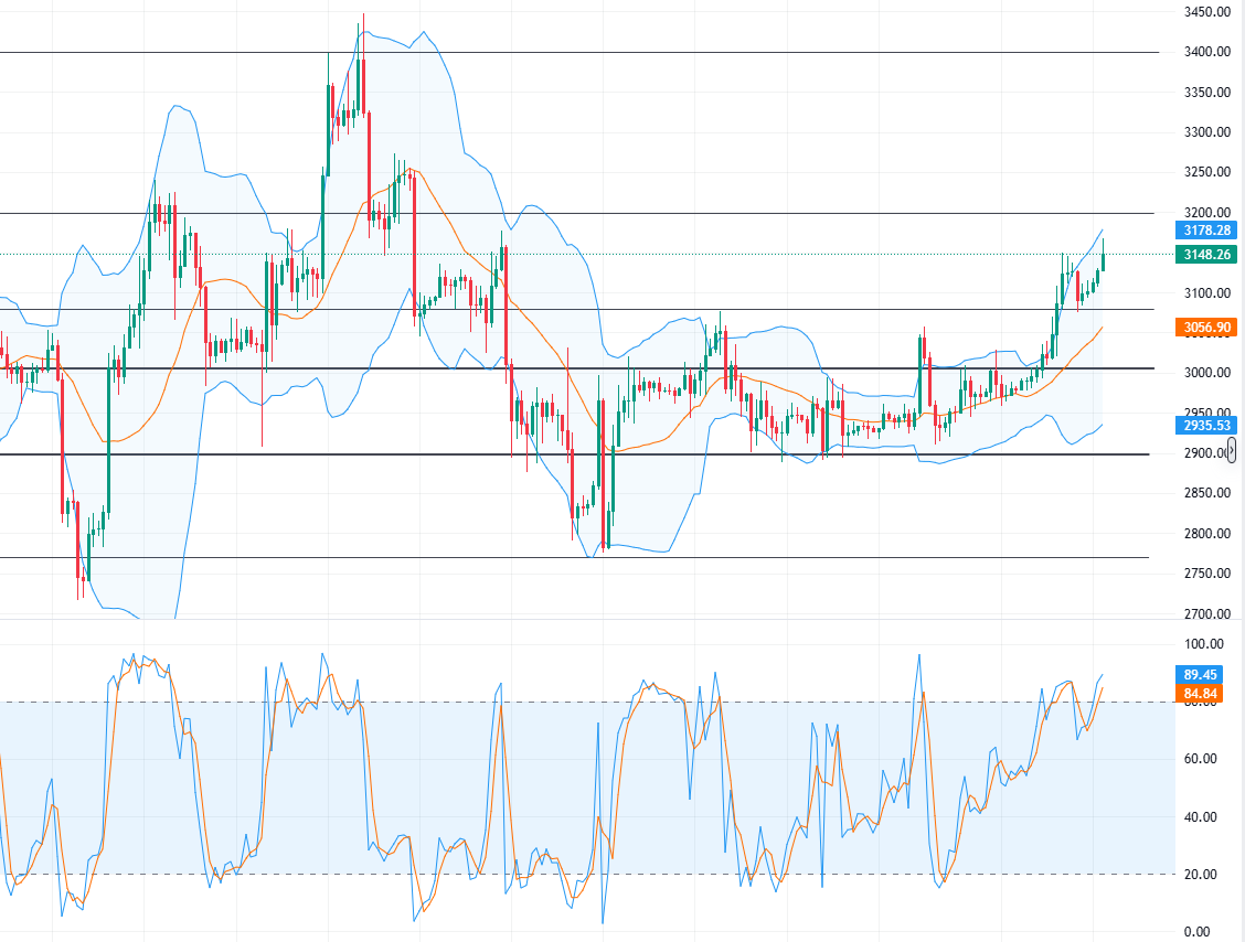 以太坊多头表现虽然也强势,现在也撑开日图上轨进一步测试上方强阻力区域,四小时均线朝上发散运行预示价格有望延续多头,不过RSI进入超买区且小时级别RSI已经从超买区拐头,价格看涨但短期有回落,日内先看修正情况。下方短期支撑关注昨日回调低点3080-3060区域,重点还是防守3000关口,至于上方短期阻力关注3200-3250区域,如果今晚尾盘凌晨延续强势并继续突破,那下周将会再次测试上个月高点区3300-3450区域。