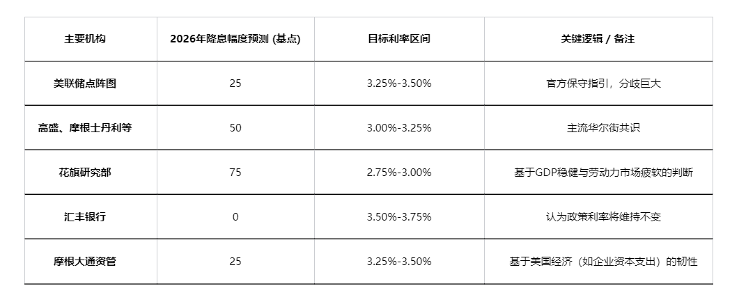 对于2026年的加密市场而言,美联储的货币政策仍是决定其“水温”的核心变量。然而,当前市场与美联储之间、乃至各大机构之间,对于未来利率路径的判断出现了罕见且深刻的分歧