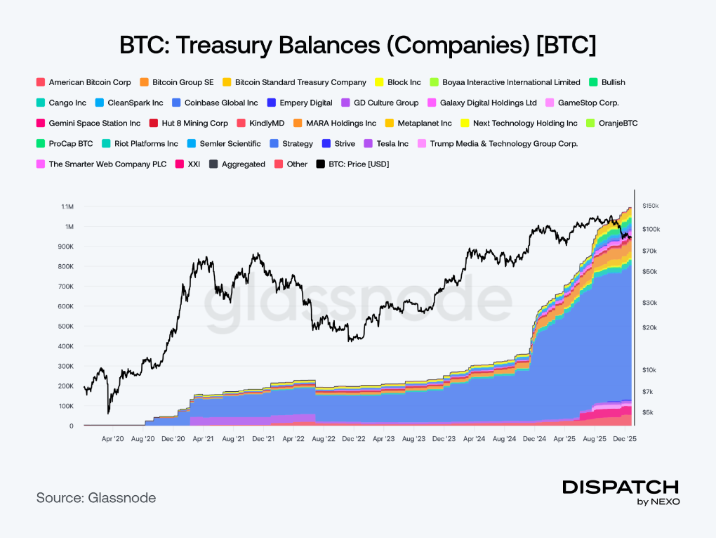 其价格能否突破前高,将高度依赖于现货ETF等机构渠道能否持续吸收这部分供给。比特币正日益成为企业资产负债表上的战略资产。数据显示,企业持有的比特币已从2023年初的约19.7万枚,飙升至超过108万枚,增长超450%。