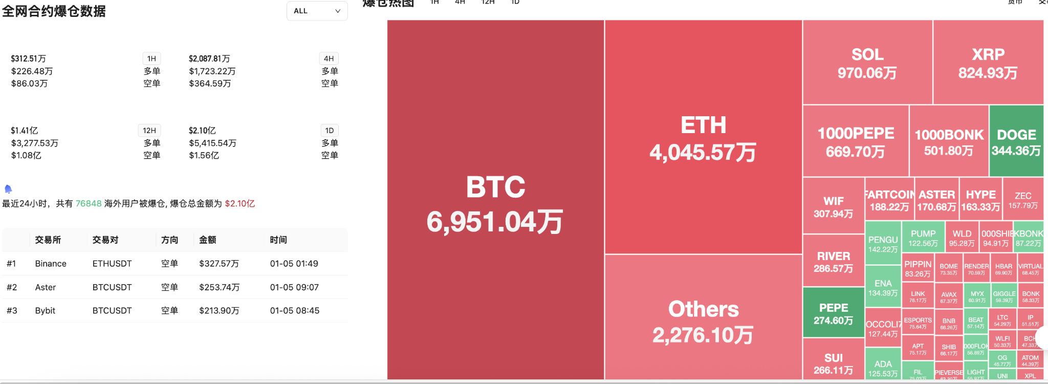 - 24小时爆仓数据:全球共76848人被爆仓 ,爆仓总金额为2.1亿美元,其BTC爆仓6591万美元、ETH爆仓4045万美元、SOL爆仓970万美元