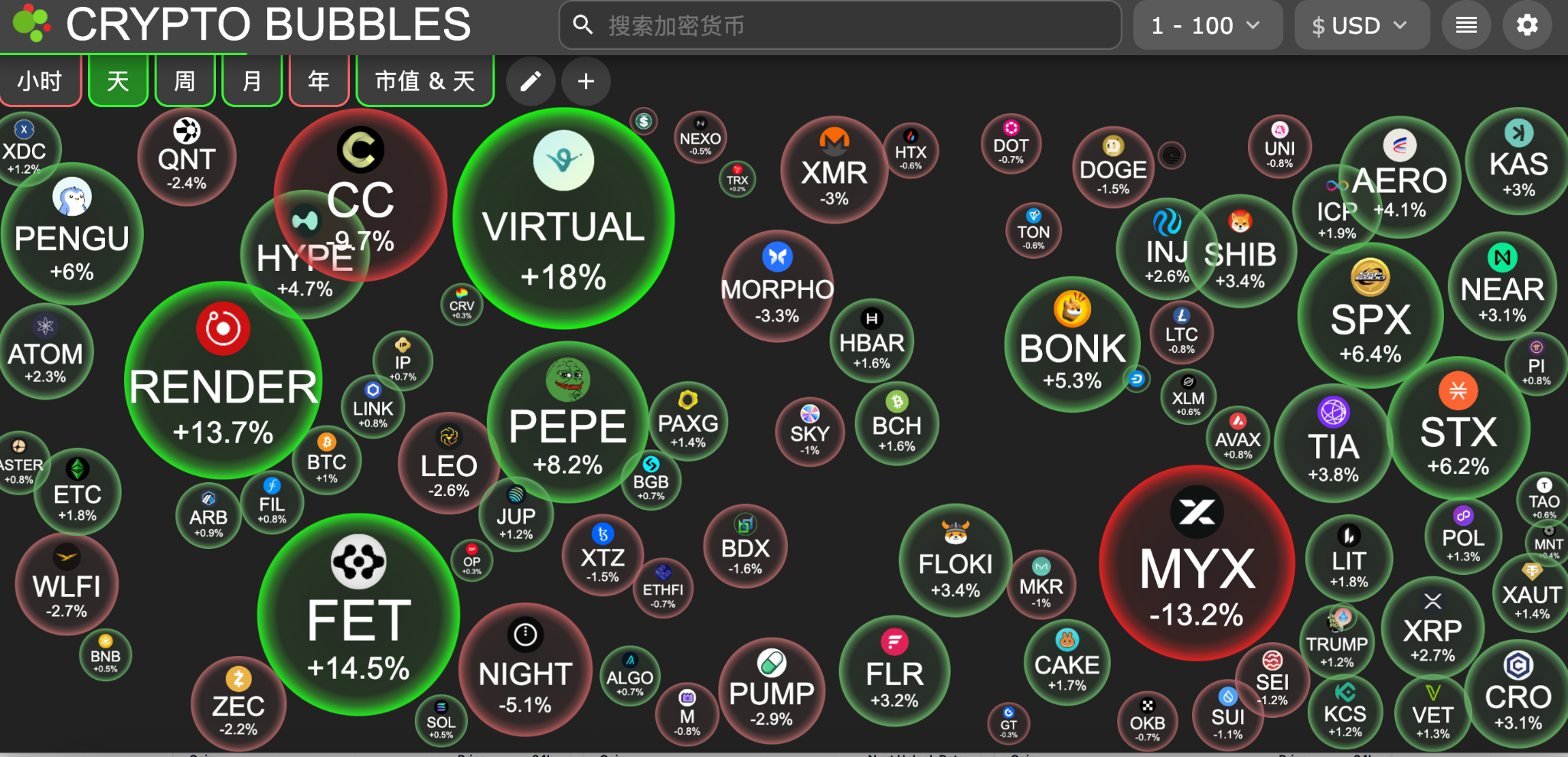 今日市值前100币种最大涨幅:Virtuals Protocol涨18%、ASI Alliance涨14.5%、Render涨13.7%、Pepe涨8.2%、SPX6900涨6.4%。
