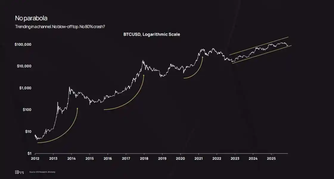 比特币的对数价格图表显示,自 2022 年以来,其价格在上升通道内缓慢上行,避开了早期周期中出现的抛物线式飙升和 80% 的暴跌。
