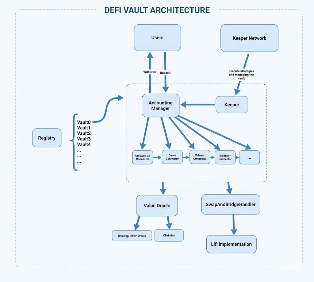 NOYA Vault(金库)的技术架构:各金库通过 Registry 统一注册与管理,AccountingManager 负责用户份额(ERC-20)与净值定价;底层通过模块化 Connectors 对接 Aave、Uniswap 等协议并计算跨协议 TVL,依赖 Value Oracle(Chainlink + Uniswap v3 TWAP)完成价格路由与估值;交易与跨链由 Swap Handler(LiFi) 执行;最终,策略执行由 Keeper 多签 触发,形成可组合、可审计的执行闭环。