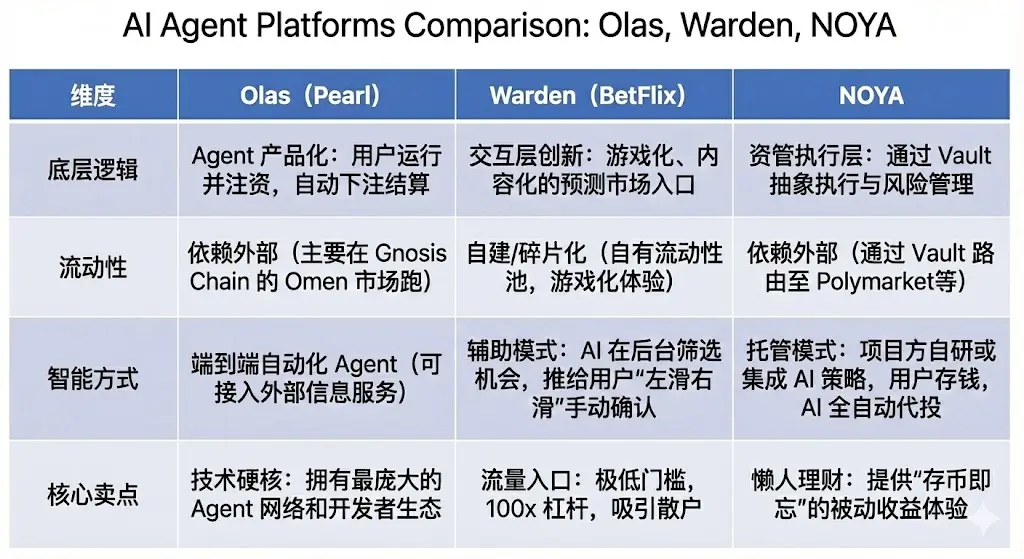 3)NOYA.ai:以“资金托管 + 策略代执行”为核心,通过 Vault 将预测市场与 DeFi 执行抽象为资管产品,提供低操作、低心智负担的参与方式。若后续叠加 Prediction Market Intelligence 与 Agent 执行模块,有望形成“研究—执行—监控”的一体化工作流。