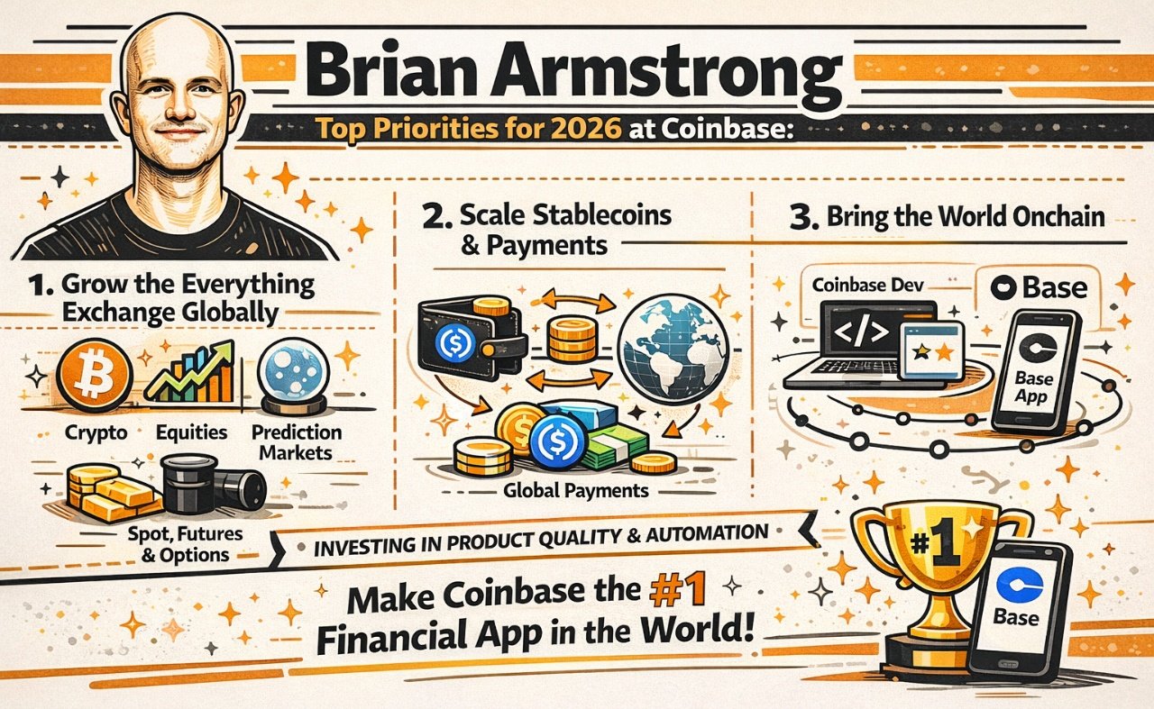 Coinbase首席执行官布莱恩·阿姆斯特朗(Brian Armstrong)在2026年1月1日的社交媒体平台X上分享了一份以规模、多样化和链上采用为中心的前瞻性路线图。他表示: