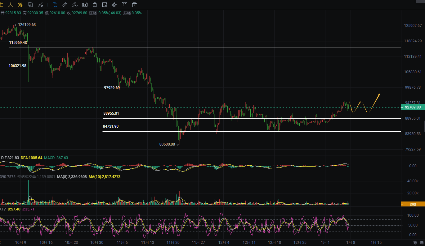 老样子继续详细解读下技术面指标走向,大饼日线级别显示,近期价格在高位震荡后出现短线回落,形成较长的阴线,表明上方抛压较重。小时线级别中,价格从93000以上区域逐步下跌,目前处于短期反弹后的整理阶段。技术指标小时线MACD柱状图持续为负值,DIF和DEA均向下发散,短期空头趋势明显;日线级别MACD也开始转弱,或进入调整周期。小时线RSI数值46附近,未进入超卖区,但整体偏弱;日线RSI下降至50以下,动能减弱。小时线EMA7、EMA30、EMA120呈现空头排列,当前价格受制于EMA7压力;日线EMA7拐头向下,有进一步测试EMA30支撑的可能性。日内操作上以91000为支撑,只要这里跌不破 后续继续以此向上看多即可。
