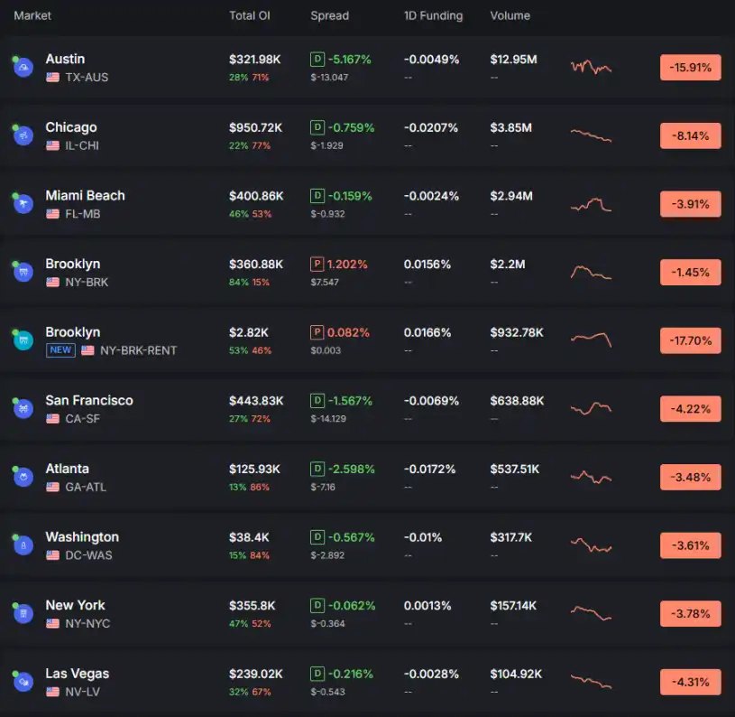 然而,大部分市场的持仓量低于一万美元,仅少数维持在数十万美元级别,如 Austin 持仓量 32.1 万美元,Brooklyn 持仓量 36 万美元,Chicago 最高约 95 万美元。