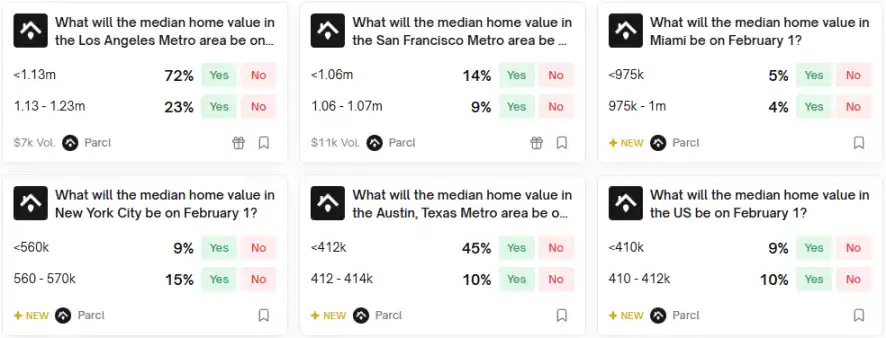 Polymarket 市场表现: Polymarket 目前已上线包括 Los Angeles、San Francisco、Austin、Miami、New York 及 US 全美在内的六个房地产预测市场。