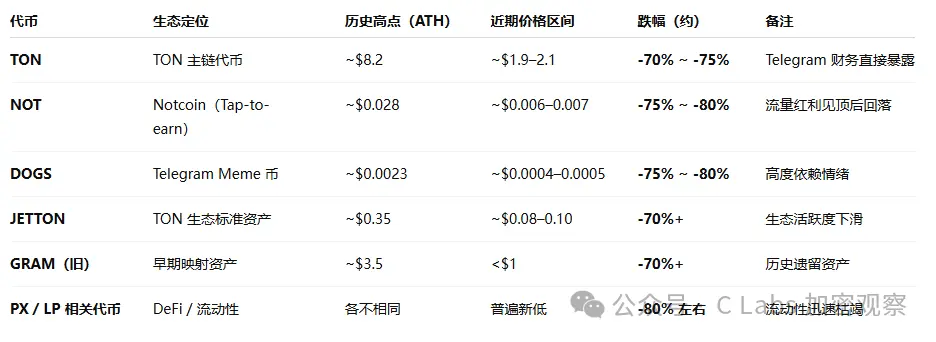 The once-popular TON ecosystem projects have dwindled, with most coin prices retracting by over 70%: