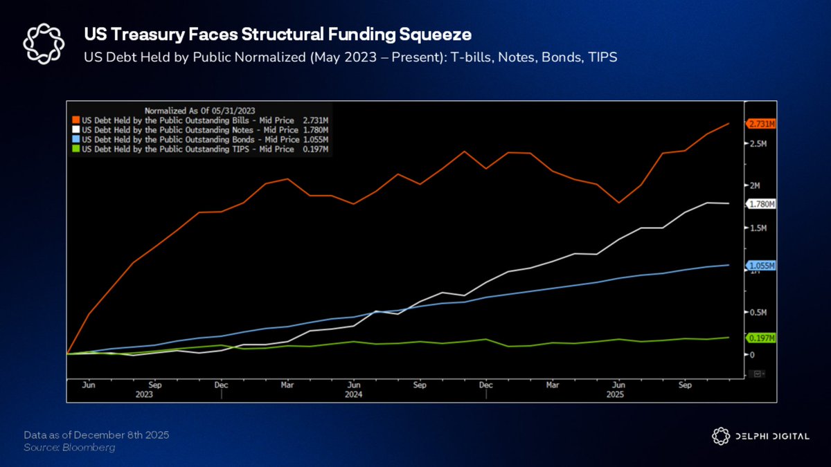 Meanwhile, the Treasury has become increasingly dependent on hedge funds running basis trades to absorb issuance. This ~$2 trillion trade now underpins the long end of the curve. Around $150B in T-bills and $300B in coupon debt matures every month. The US has nearly $10T to refinance over the next 12 months.