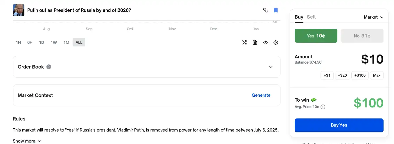但其实「彩票人」这种心理也是符合理性的。举例说明,如在「普京是否会在 2026 年底前卸任」事件合约中,在常识的驱使下,大部分人会买入「No」,概率也已经显现了人们的态度,但 Yes 侧仍存在 10% 的概率,这意味着如果押注 10 美元,那么普京真的在 2026 年底前卸任的话,将获得 100 美元回报,10 倍收益,那赌呗。