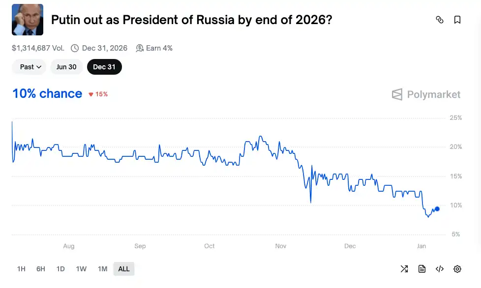 这些投入确实有效果,推动了许多「反常识」市场的交易。例如,「普京是否会在 2026 年底卸任」这一事件合约已有超 130 万美元的交易量,持有这一合约份额将获得 4% 的年化收益,对于有 Yes 份额的玩家而言,相当于最终有了 14% 的年化收益(10% 尾盘收益+4% 平台奖励),吸引力巨大。对于持有 No 份额的玩家而言,挂单奖励和持仓奖励也对冲了一部分风险。