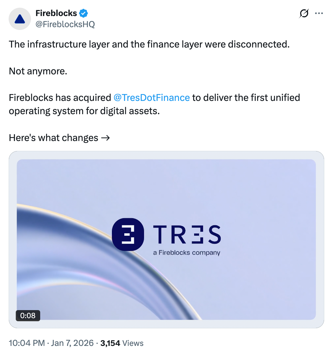 昨日,Fireblocks 对外宣布以 1.3 亿美元现金与股权相结合的方式,成功收购加密货币会计平台 TRES Finance。值得一提的是,就在三个月前 2025 年 10 月,Fireblocks 刚完成对加密钱包技术初创公司 Dynamic Labs 价值 9000 万美元的收购。短短 90 天内,连续完成两笔大额收购,Fireblocks 正在以惊人的速度搭建一个涵盖资产托管、交易结算以及合规会计的全链条生态闭环。