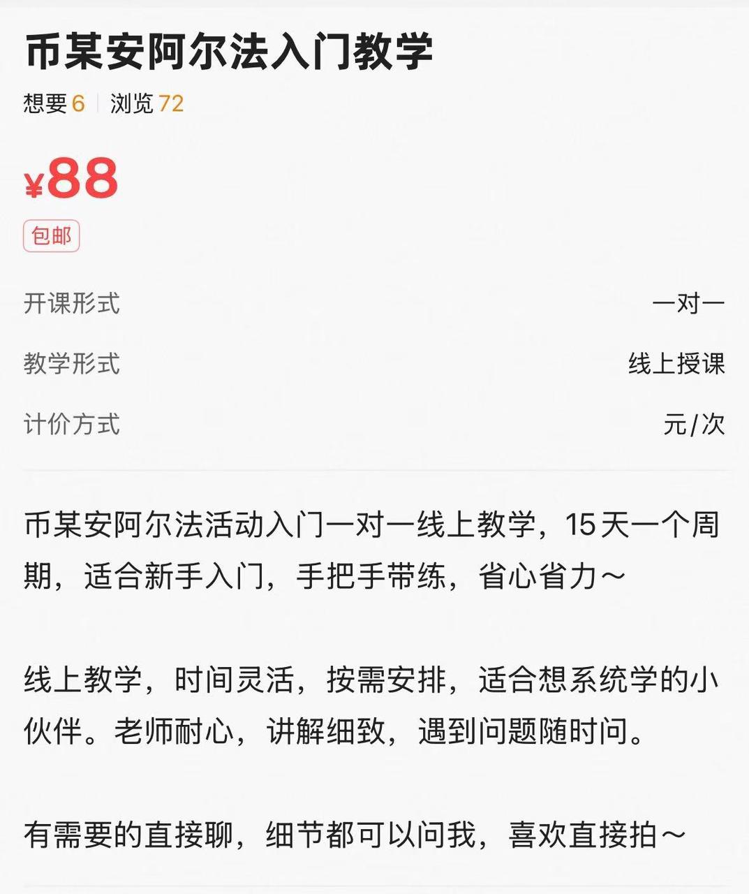 一个标价 88 元的“币某安阿尔法入门教学”商品,提供一对一线上授课,承诺“手把手带练,省心省力”。所谓的“阿尔法(Alpha)”,通常指代币安等平台推出的、允许用户通过完成任务来赚取潜在空投奖励的活动。