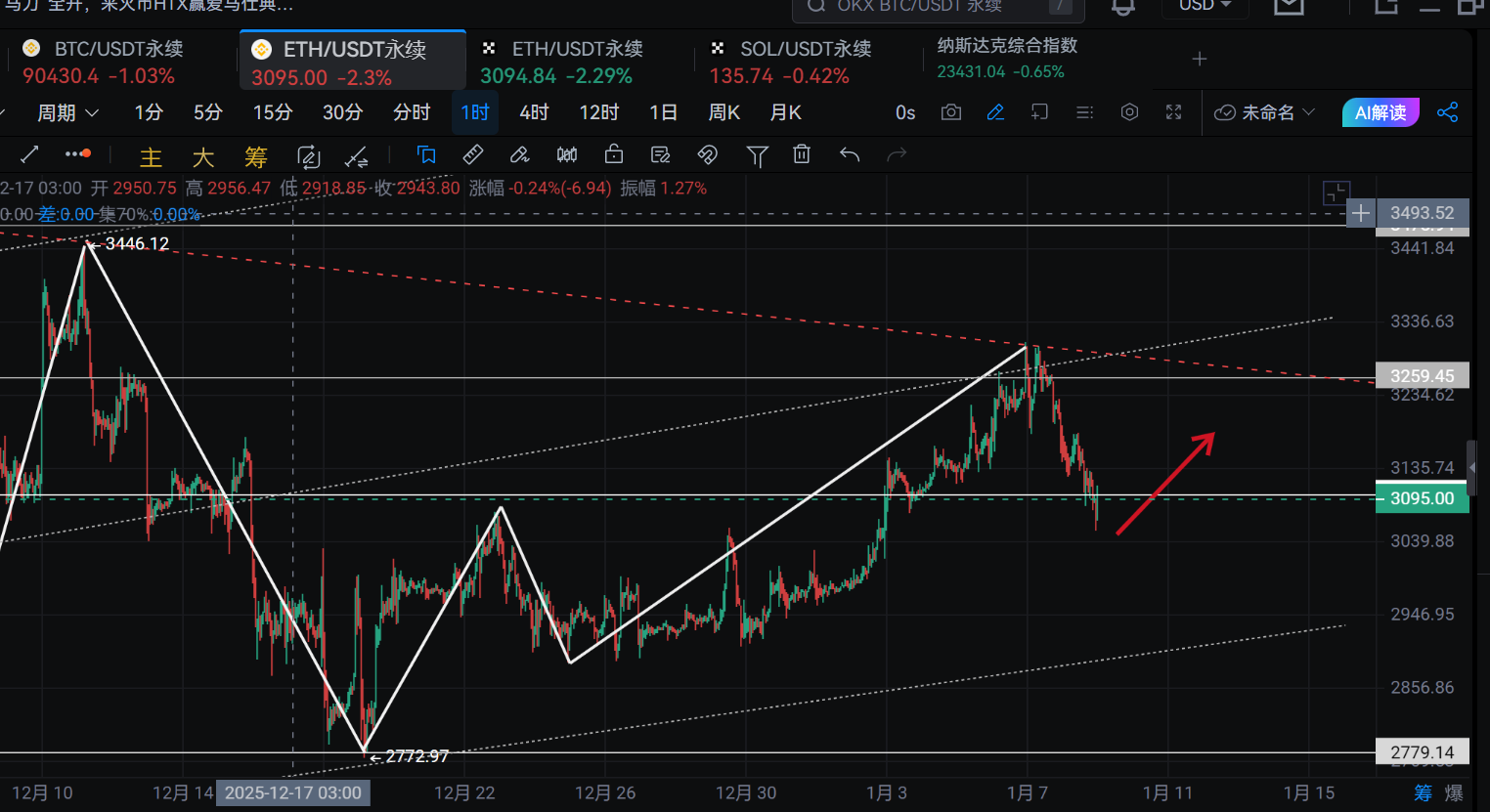 After consecutive losses, my previous self would definitely return to the main bearish route. Essentially, this week, Bitcoin has only completed a rebound and has undergone a correction. This kind of market behavior has occurred multiple times in December, with the first half still pulling upwards. Therefore, today, I am making a contrary decision based on my past subjective judgment and will go long first. With the logic of trying to break even for the trapped long positions and the profit-taking from the high shorts, we will first look at the previous resistance around 89500-90500 as a divergence for the rebound.