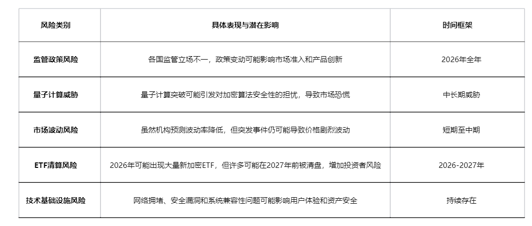 ● 市场波动性和流动性风险仍然存在。虽然机构普遍预测波动率将降低,但突发事件仍可能引发市场剧烈震荡。同时,彭博分析师詹姆斯·塞法特预计2026年将出现加密ETF密集发行,但许多产品可能在2027年前被清盘或退市。