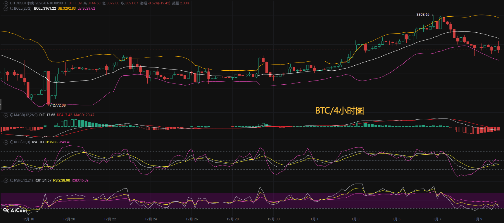 The daily line has closed in the red for three consecutive days, forming a preliminary descending three methods pattern, and the MACD has continued to diverge after a high-level death cross. On the 2-hour level, a shooting star pattern with a long upper shadow has appeared, indicating strong selling pressure near 92000. Meanwhile, the DIF and DEA have formed a death cross below the zero axis, with a decrease in the histogram volume. The price has currently fallen below the 7 EMA (90869) and is under pressure from the 30 EMA (91126). The 120 EMA below will become a key support level, and overall, it is within a wide consolidation box of 89500-91500 on the 1-hour level, maintaining a weak consolidation trend in the short term. The key resistance above is still around 92000; without a breakthrough and stabilization, the upper space will not open up, and the increase will not be extended further. Therefore, Mr. Coin advises against blindly chasing the rise and to be cautious of the price retracing to support again. The support below to watch is 89000.