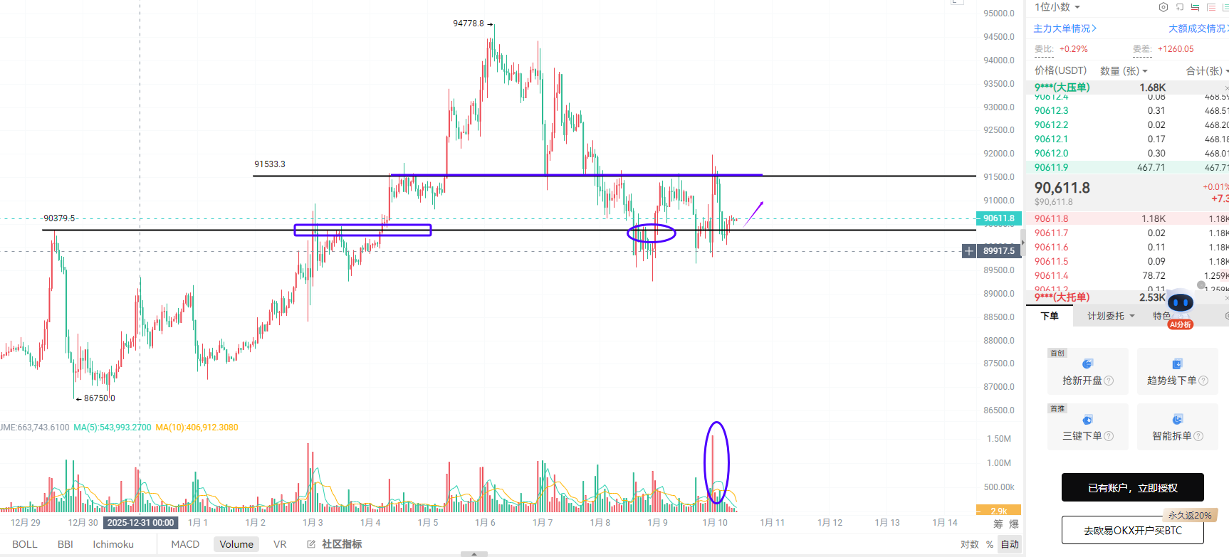 BTC:大饼昨天晚上也是在冲高91500附近后再次面临压力,上一篇文章中我们反复提示到大饼现在多头发力的压力位就是要放量站稳91500.下方支撑90400附近,没有跌破就是我们多单进场的位置,所以现在的大饼也好还是太太也好整体的趋势并没有出现明显的放量突破,一直在颈线附近形成箱体区间震荡,操作上就遵循一点,等到合适的位置,回踩不破支撑多单,突破压力位不放量就空。