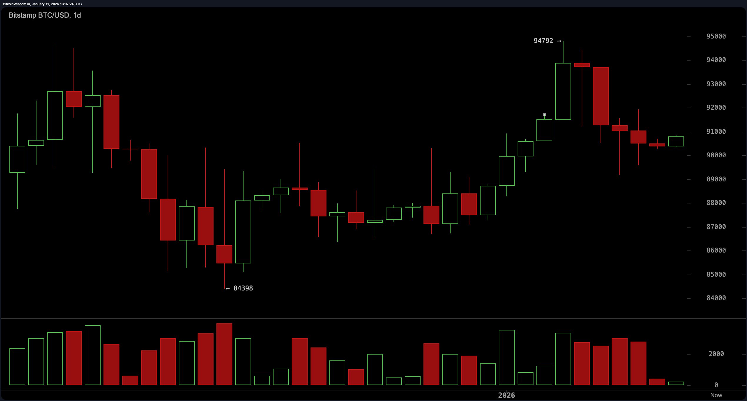 BTC/USD 1-day chart via Bitstamp on Jan. 11, 2026.