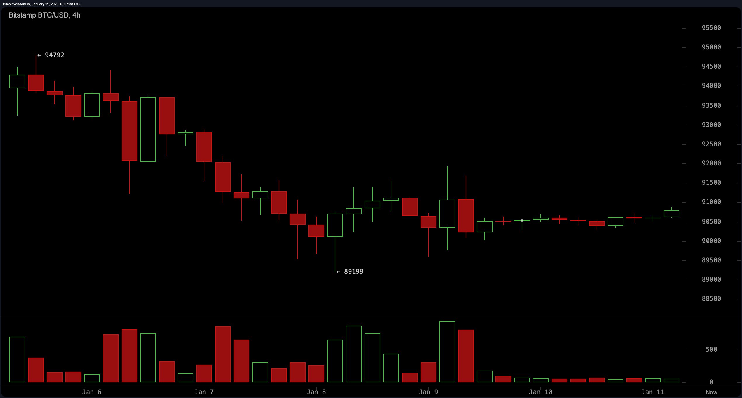 BTC/USD 4-hour chart via Bitstamp on Jan. 11, 2026.