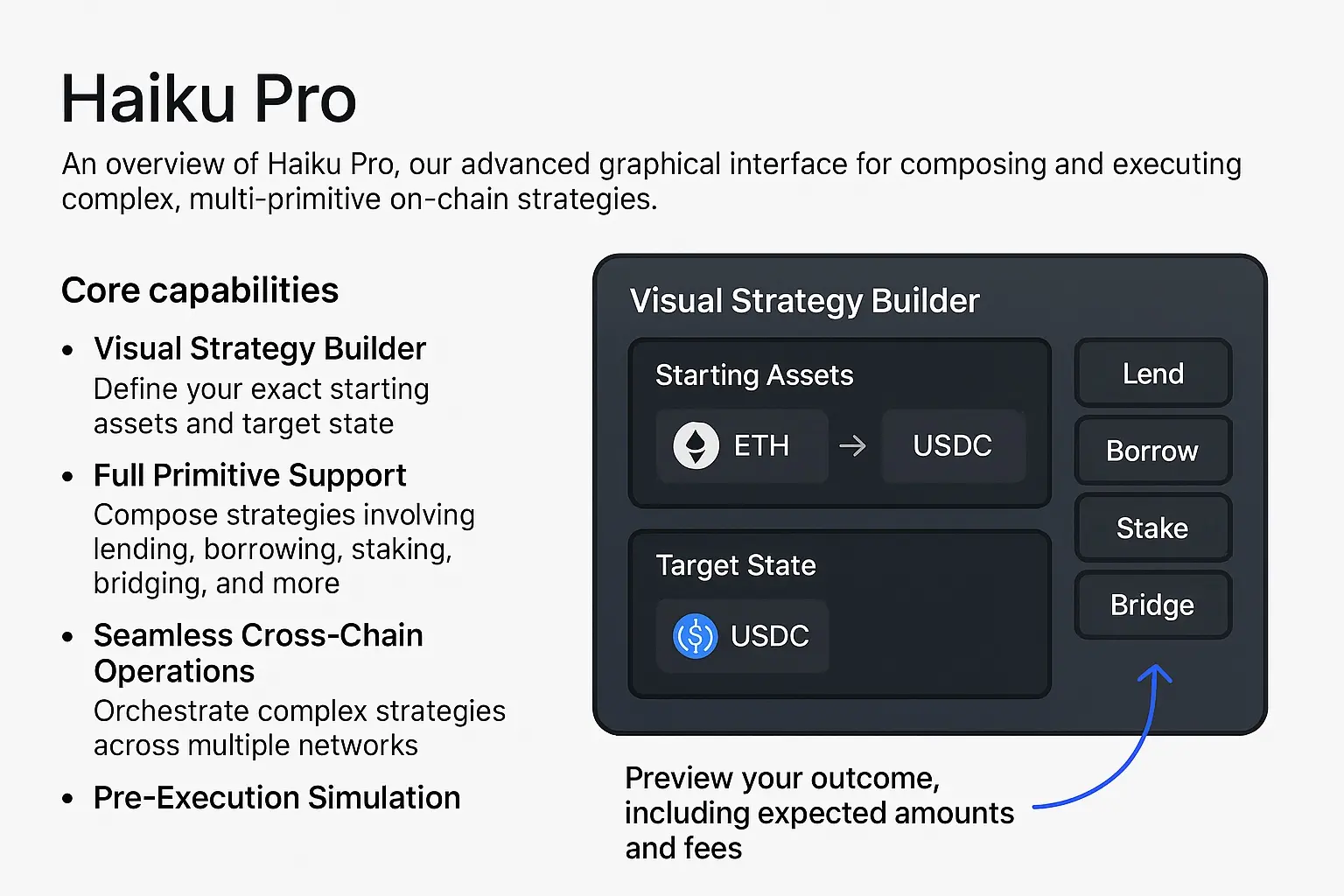 Haiku Pro 是一个面向专业交易者、资产管理人与 DeFi 高阶用户的 高级图形化策略界面,能够在无需编写任何代码的情况下,通过可视化方式构建并执行复杂的多步骤链上策略。