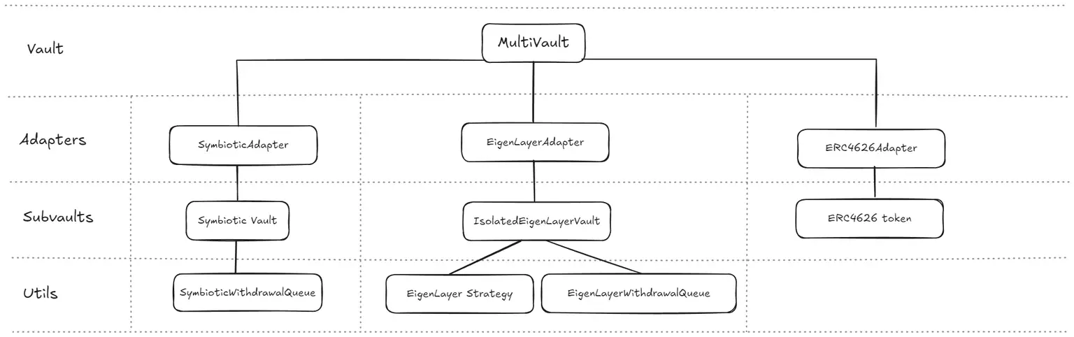 MultiVault 是一个面向多来源收益与再质押场景的资产聚合金库,通过模块化设计统一管理不同协议的收益、再质押与流动性。系统基于扩展版 ERC4626,实现限额、白名单与锁定等高级功能。