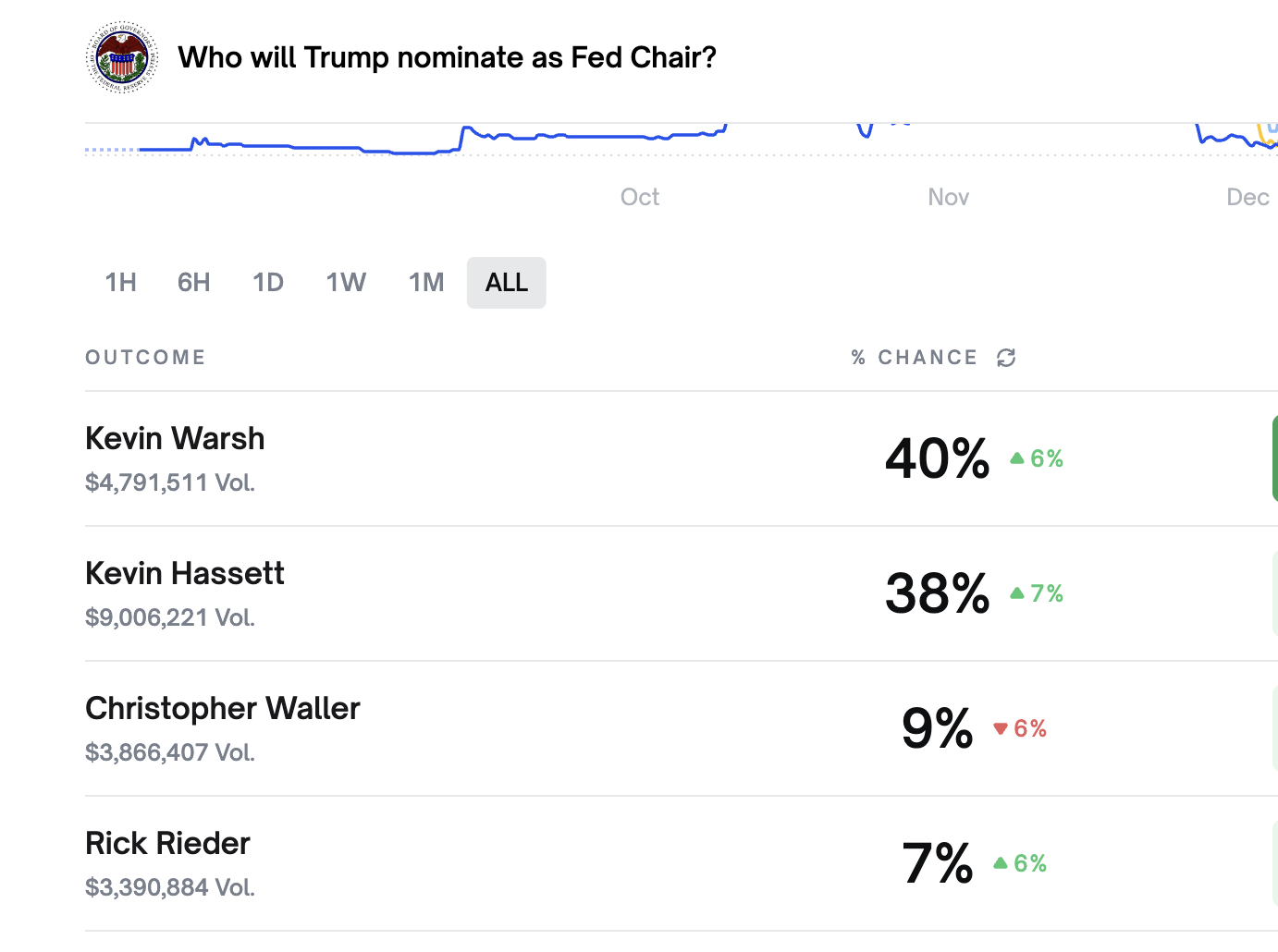 截止发文,Polymarket 数据显示,Kevin Warsh 当选美联储主席的概率暂报 40%(上涨 6%),Kevin Hassett 当选美联储主席的概率暂报 38%(上涨 7%),Christopher Waller 当选美联储主席的概率暂报 9%(下跌 9%),Rick Rieder 当选美联储主席的概率最低、暂报 7%(上涨 6%)。虽然与 Warsh 和 Hassett 的胜率相比较低,但至少上涨了 6 个点,马上就可以把 Waller 斩于马下。