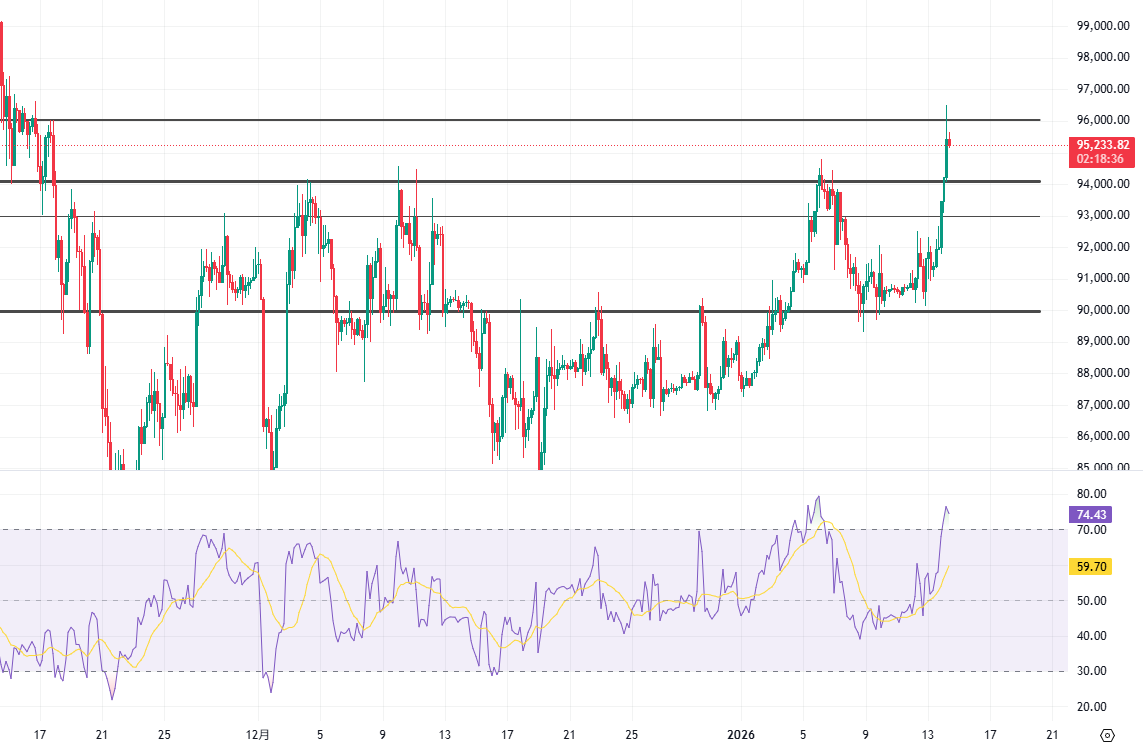 From a technical perspective, the upper Bollinger band for Bitcoin on the daily chart has been effectively expanded, breaking the previous consolidation range. The short-term moving averages show a bullish divergence pattern, and the trend structure has clearly strengthened; the four-hour level is also in a bullish arrangement, with momentum bars continuing to expand, indicating that bulls are in control. However, from the hourly level, indicators have entered the overbought zone and are starting to turn, showing a clear need for correction. In the short term, a pullback or sideways movement to digest profit-taking cannot be ruled out. Today, focus on the pullback and repair situation, with key support in the 94,000–93,000 area and short-term resistance in the 96,000–97,000 area, where there is still concentrated divergence between bulls and bears. However, with this round of increases approaching the upper resistance area, medium to long-term opportunities are also emerging.
