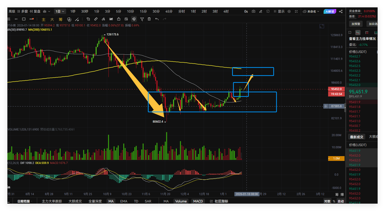 When it previously reached a rebound near 94, I suggested that everyone could short in the short term. This short-term pullback low is at 89268, with at least 2-3000 points of profit. Last night, the rebound broke through the 94 resistance, and the future market will be vast; from the daily chart, after falling from a high of around 126000 to about 80,000, it has been oscillating at the bottom. The short-term pressure at 94 has not been effectively broken until last night, when it closed with a bullish candle and did not form another pin bar, which is considered an effective breakout. After breaking the 94 resistance, this level can serve as a support point. There are no signs of a top in the short term, so continue to go long in trading. The current price around 95400 can be directly positioned, and if it goes down to around 94, add to the position once. The suggested stop loss is 93000, with the target first looking at around 98000. After reaching that, pay attention to whether there are short signals around 98. If not, it will continue to rebound. This rebound should at least reach 100,000. Seize the opportunity to enter. The long position suggested around 85500 should continue to be held; for short-term trading, control risks and manage profits and losses independently;