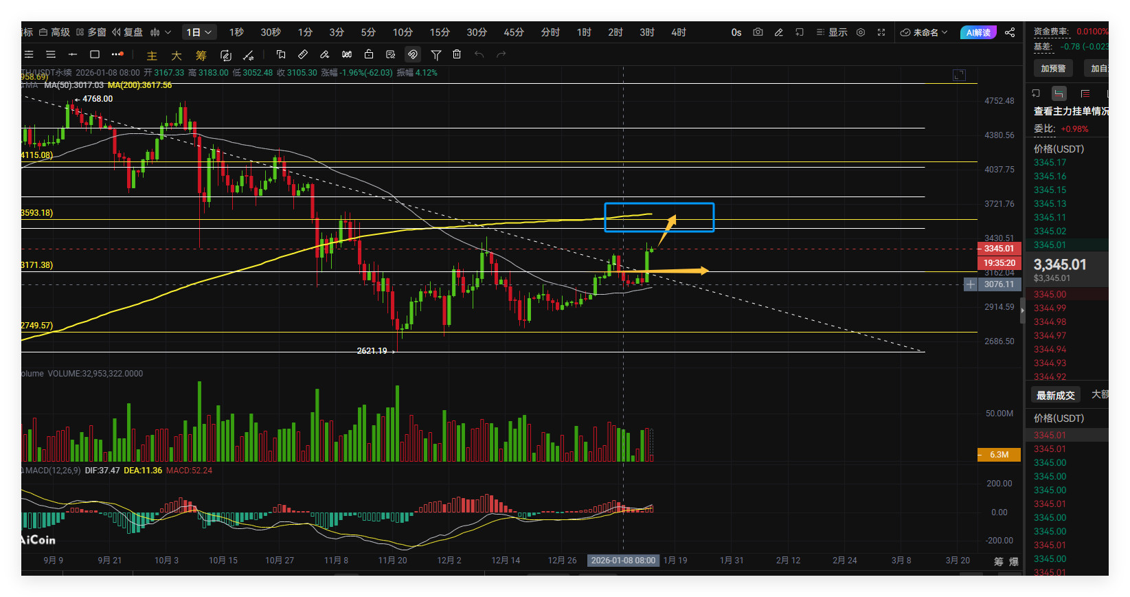 Ethereum also produced a large bullish candle, and its current trend is in a strong bullish phase. Do not short in trading; there is a high chance that Ethereum will touch the 200-day moving average, which is around 3600. In trading, just go long; the current price around 3340 can be pursued directly, with an additional position at 3240. The stop loss is 3180, and the target is 3550-3600. The long position suggested around 2750 should continue to be held, with a target starting with 4. Manage profits independently; for short-term trading, control risks and manage profits and losses independently;