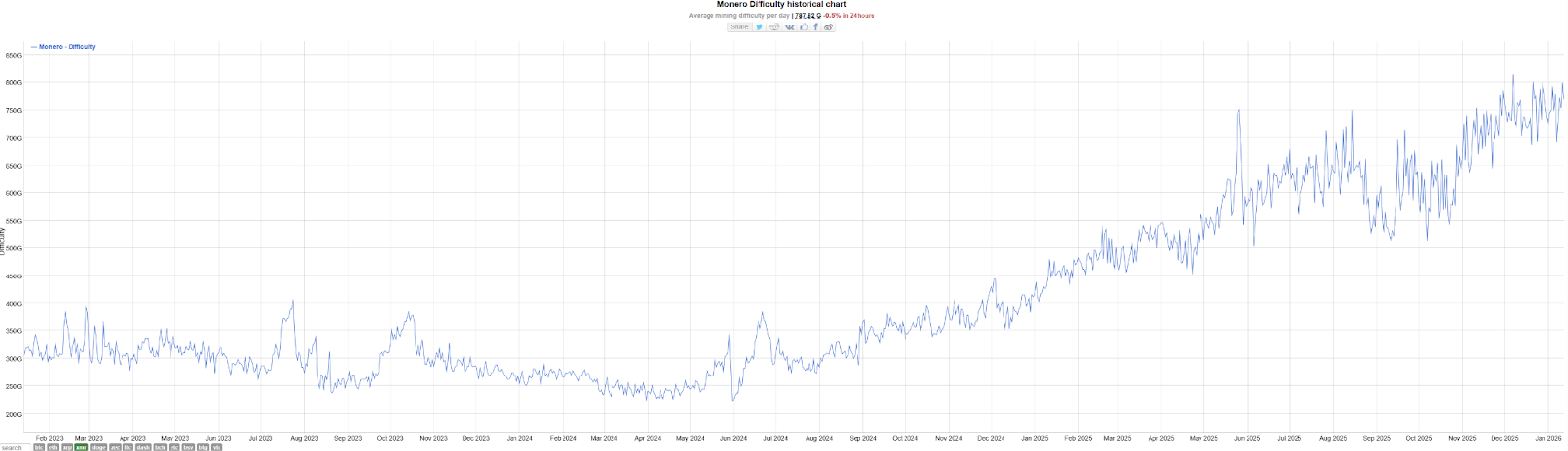 Before April 2025, Monero's mining rewards experienced a significant decline. Coupled with the difficulty chart at that time, hash power surged sharply while coin prices remained volatile. This divergence led to a dilution of rewards, potentially forcing some higher-cost small miners out of the market. Data shows that the mining difficulty did indeed pull back in April, confirming this hypothesis.