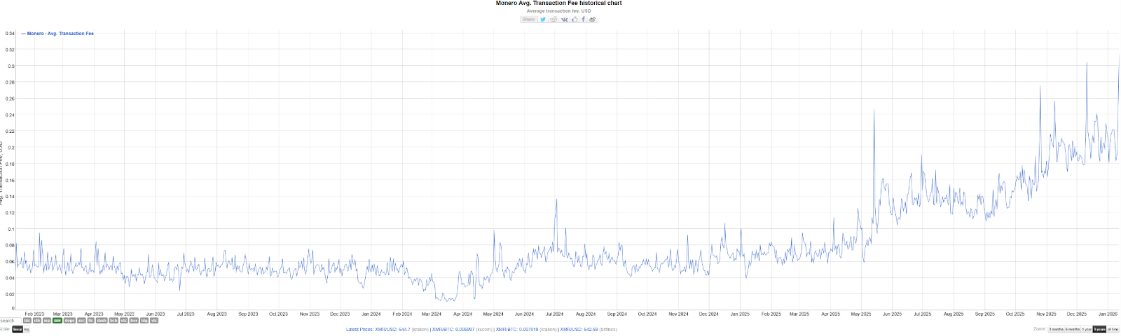 From the chart, Monero's average transaction fees remained relatively stable below $0.1 before the first half of 2025. However, starting in June, a growth trend began to emerge; by December 11, the highest average fee reached over $0.3, more than three times the amount from six months prior.