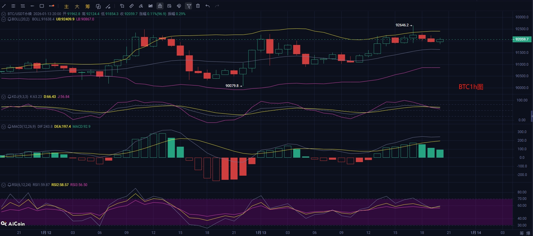 4小时图中,布林带开口向上但价格有向中轨回踩迹象,KDJ三线进入超买区间后拐头向下,回调压力显现,MACD柱状线较前一周期缩量,多头量能开始减弱,RSI短期指标超买拐头,指标背离信号初现。整体来看,4小时级别多头趋势虽未被完全破坏,但超买引发的回调需求升温,短期价格或先向EMA15(93300)及布林中轨寻求支撑。1小时图则呈现更明显的短期空头特征,KDJ高位形成死叉后向下运行,MACD死叉且柱状线负向放量,RSI全线走弱,价格在布林带中上方震荡,下轨为短期重要支撑。短周期的回调属于日线多头趋势中的技术性修正,若1小时布林中轨、4小时EMA15等支撑位依次守住,价格完成指标修复后将大概率延续日线上行趋势。