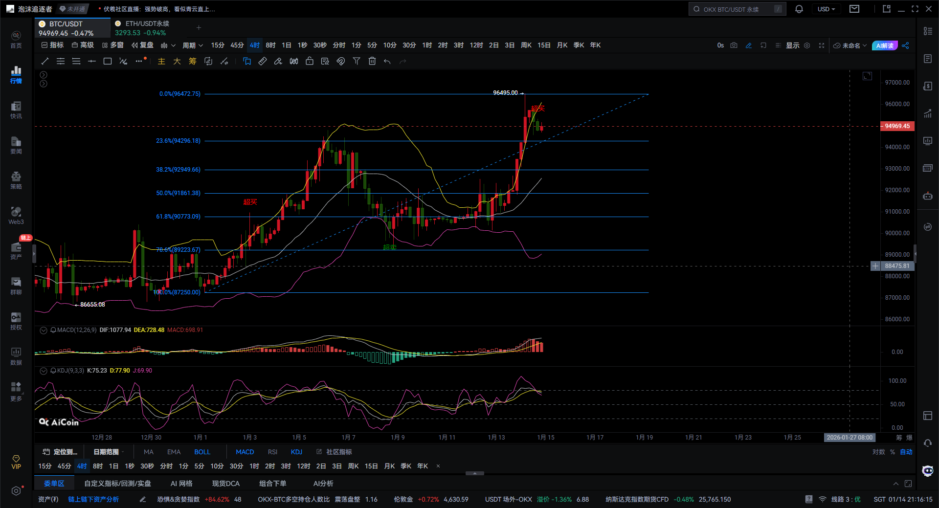 Through Fibonacci retracement analysis, key support levels are quite clear: the 23.6% level is around $94,296, forming the first support; the 38.2% level is around $92,949, which is a stronger support area; the 50% level is around $91,861, which can be seen as the lifeline for bulls. From the current perspective, the range of $94,200 to $93,000 is the most likely area to form a bottom and enter a consolidation phase. The $91,800 level is crucial; if it is broken, one should be cautious of a potentially deeper short-term adjustment.