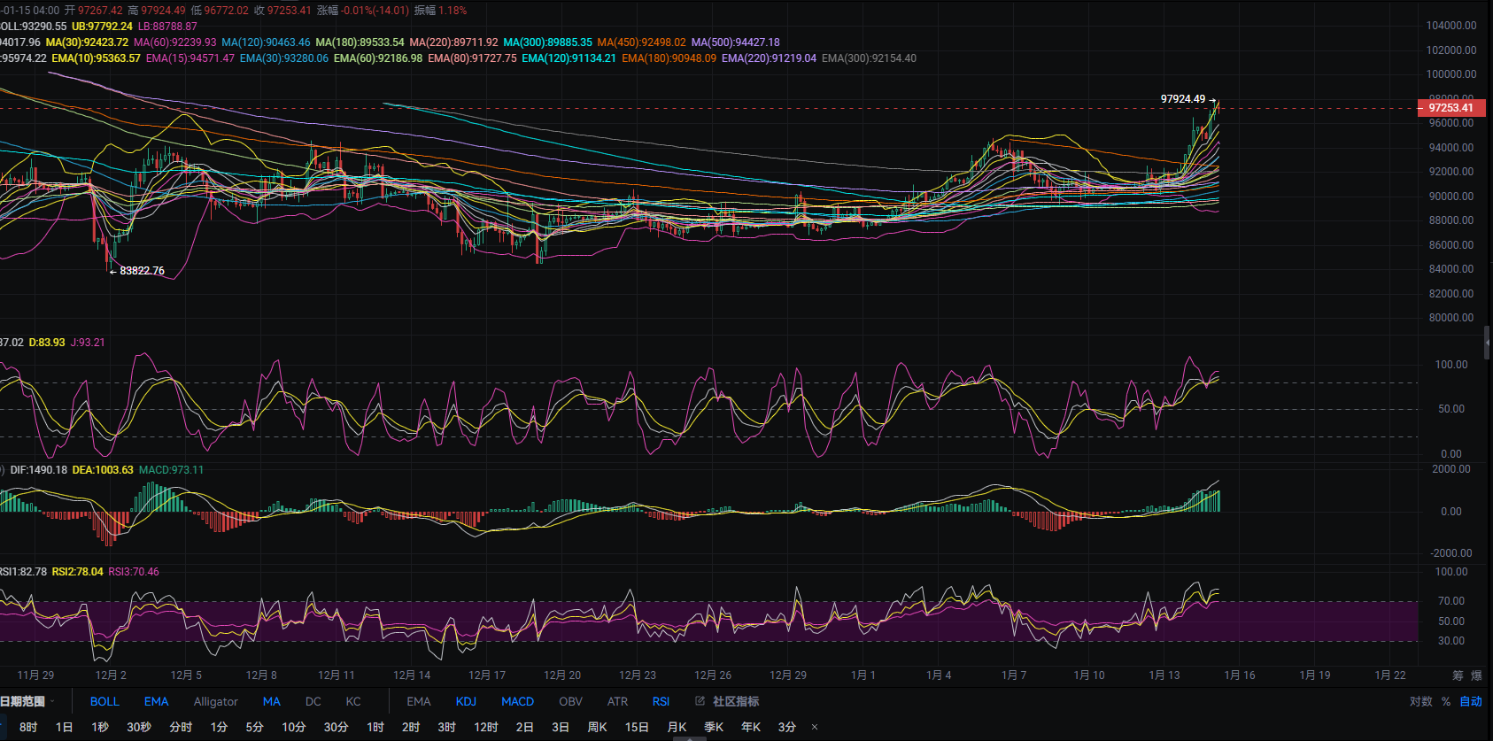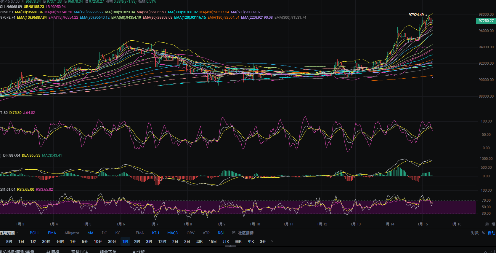 After Bitcoin surged close to the 98,000 mark in the early morning, it faced resistance and retreated. The 1-hour MACD is forming a contraction above the 0 axis, and the fast and slow lines are successfully converging for a potential death cross. The KDJ three lines are turning downwards and crossing near 50. In the short term, the bearish trend may test the middle track at the 96,000 mark as the first support. If it breaks below the MA30, it may approach the lower track and MA60. The current level of the Bollinger Bands is in an opening shape. Although the coin price has been relatively strong recently, Lihui does not recommend chasing long positions at high levels!