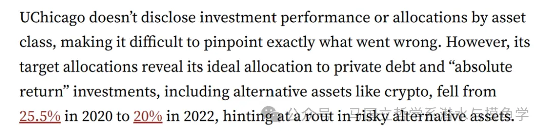 只不过,我们不知道究竟这些亏损和盈利中,有哪些来源于炒币。斯坦福大学校报,则给出了一个不太靠谱的线索:“[芝加哥大学的]目标资产配置显示,大学对私募债务和‘绝对回报’类投资(其中包括加密货币等另类资产)的理想配置比例,已从2020年的25.5%下降到2022年的20%,这暗示了高风险另类资产出现了一轮明显的撤离(或下挫)。”