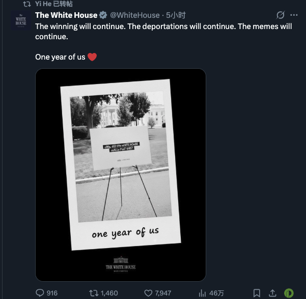 Outsiders watch the excitement, while insiders see the subtleties. He Yi's remarks not only resonate with the community, but seasoned meme players have already realized that the previous BSC meme model is collapsing from the top down. The BSC chain memes that successfully outpaced on the morning of January 21 may just be an appetizer. Ironically, memes also originated from the art of "wordplay," but this time it has turned into the White House.