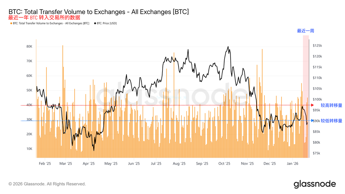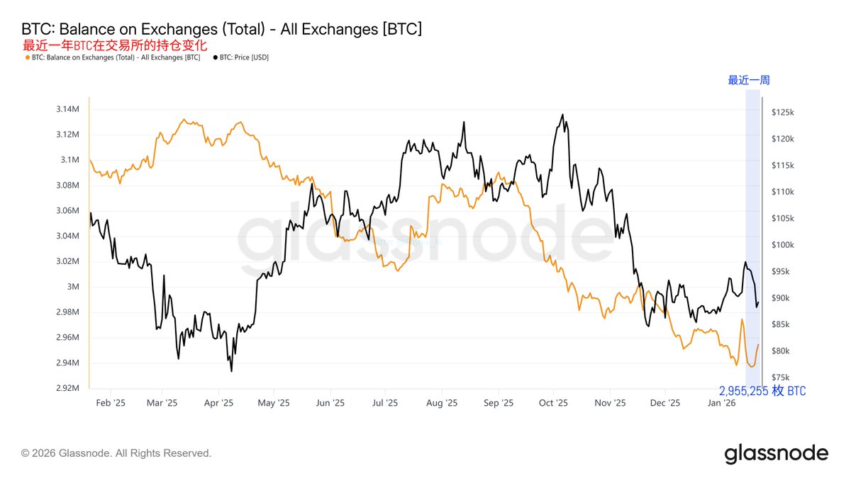 即便是在上周日凌晨川普宣布要给格陵兰相关国家加关税导致了 Bitcoin 价格的下跌,但仍然没有出现大量抛售的迹象,反而是随着 BTC 价格的下跌,交易所出现了最近一年存量的最低值。