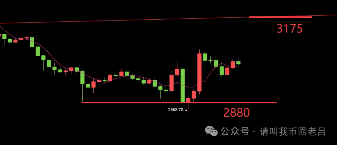 大家好,我是老吕,前天是大跌横穿多头,昨天是多空洗盘,多空双杀,但是你只要记住老吕说的两个技术点,你就不会吃亏上当,昨天我们对于以太坊说的很清楚,主要是两个观点,第一个观点,价格只有破了2880,看到了2840后,你才能追空,因为只要跌到了2840,价格实体破位的概率才高,但你看昨天,价格小破2880支撑到了2863虚破,后直接收大阳拉起来,这就是价格指引带来的实破和虚破的区别。再去看小时线K线形态,每一根阳线实体部分,都是牢牢挂在2880上方。第二个观点,上行压力位3070,凌晨价格到了这个位置,是不是又跌了100美金。两个观点完全在我们的预判之中,很多人一看价格涨太多,跌太多,就着急操作,其实脑袋里根本没有准备,也没有思路,看到了价格涨了,你想追多,价格跌了,你想追空,那么后果就比较严重。什么叫有准备的仗,就是你心理有准备,价格来了,你能从容面对,更知道你该怎么做。上下3070压力,下行2880的支撑,这就是有准备的仗,这两个技术点走完以后,我们又该如何应对接下来的行情?