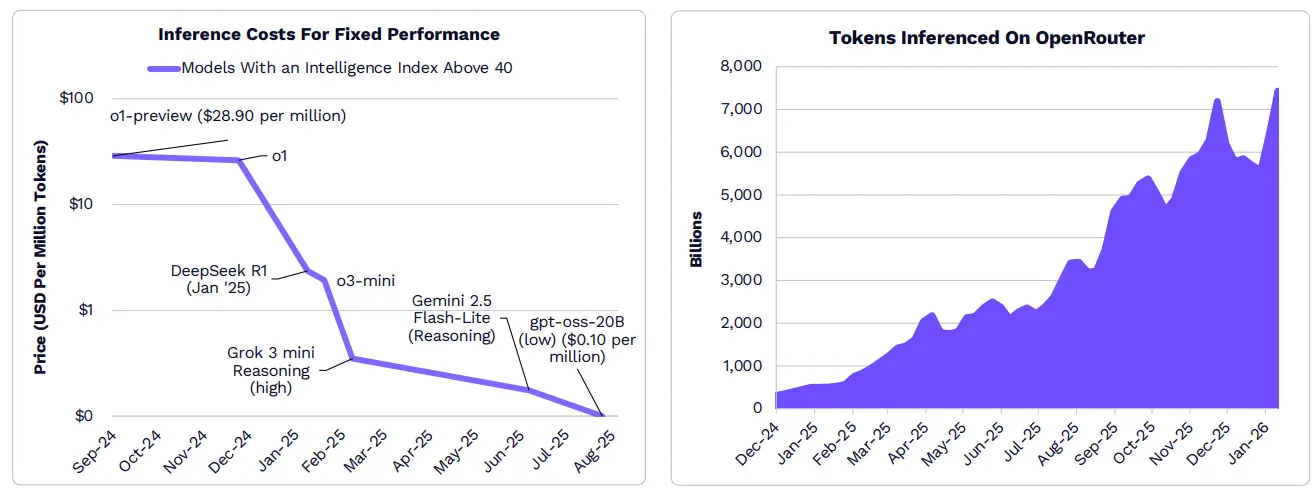 从某些指标来看,过去一年推理成本下降了超 99%。随着 AI 原生应用的激增,成本的下降正推动开发者、企业和消费者推理的 token 数量爆炸式增长。自 2024 年 12 月以来,OpenRouter(一个用于访问大型语言模型的统一应用程序编程接口 (API))的计算需求增长 25 倍。
