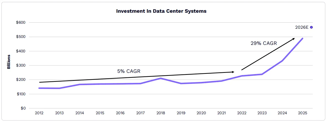 “ChatGPT 时刻以来,数据中心系统的增长速度已从 5% 加速至 29%,年增长率持续攀升。