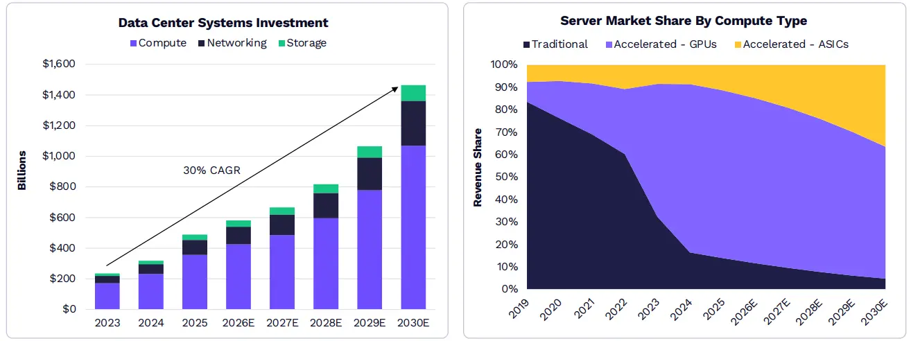 随着 AI 工作负载在企业和消费者环境中扩散,到 2030 年,AI 基础设施投资可能超过 1.4 万亿美元,其中大部分将用于加速服务器。ARK 研究表明,Broadcom 和亚马逊旗下 Annapurna Labs 等公司设计的 ASIC 将继续占据市场份额,因为 AI 实验室和超大规模企业都在寻求经济高效的计算能力。