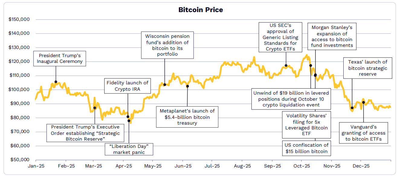随着比特币作为避险资产的角色不断增强,其波动性已有所降低。从 5 年、3 年、1 年和 3 个月的时间跨度来看,2025 年比特币的跌幅相对于历史水平较为平缓。