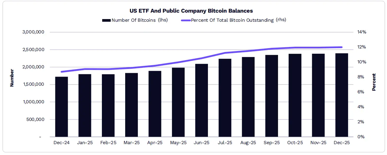 2025 年,比特币 ETF 的持有量增长 19.7%,从约 112 万枚增至约 129 万枚;而上市公司持有的比特币数量增长了 73%,从约 59.8 万枚增至约 109 万枚。因此,由 ETF 和上市公司持有的比特币总量占比从 8.7%上升至 12%。