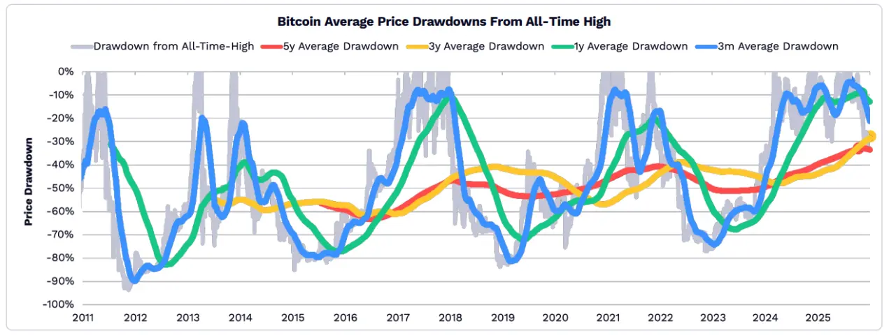 2025 年,比特币价格相对于其历史最高点的平均跌幅有所平缓。