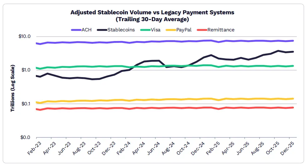 2025 年 12 月,稳定币交易量 30 天移动平均值为 3.5 万亿美元,是Visa、PayPal 和汇款(Remittances)总值的 2.3 倍。