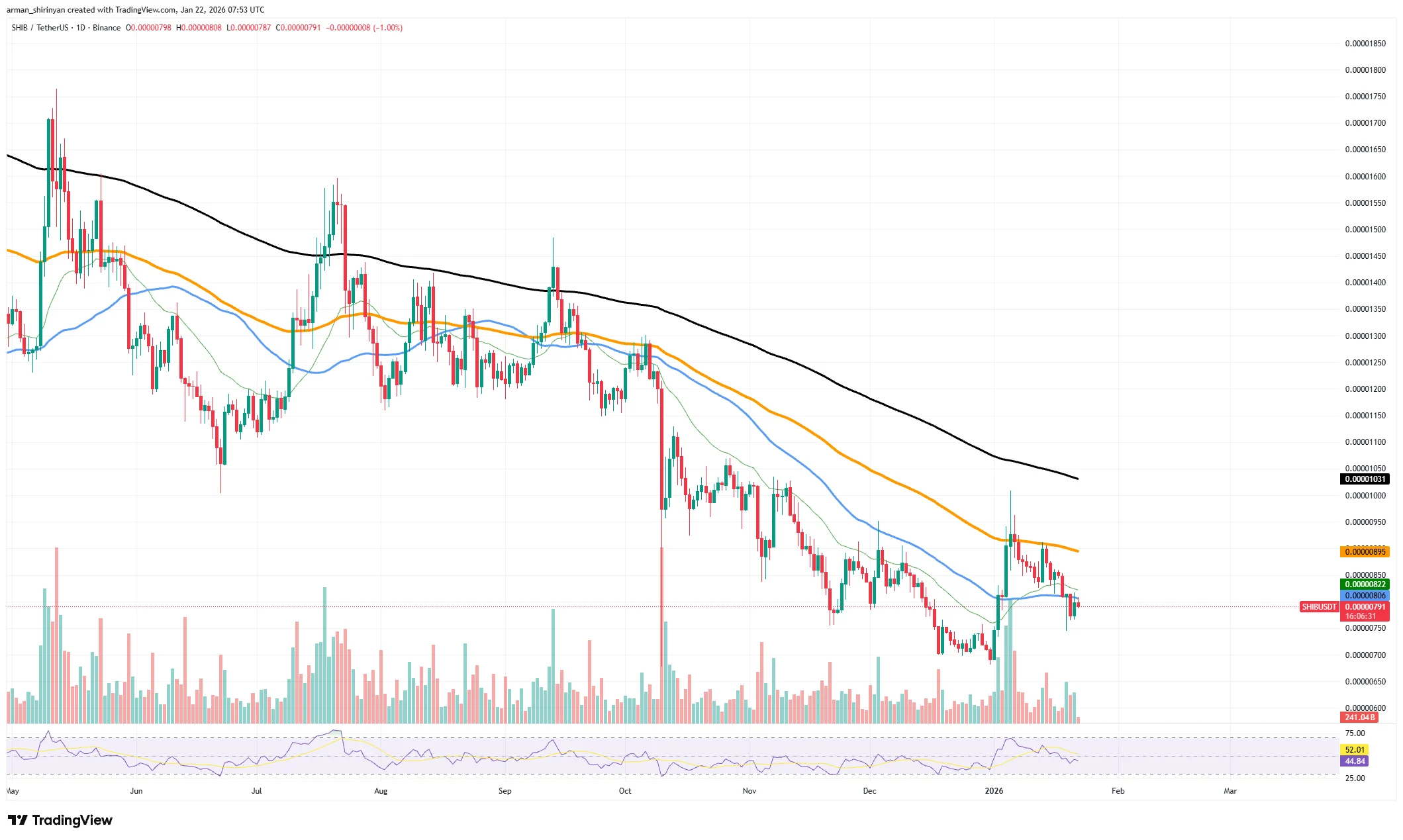 在恢复短期移动平均线的每一次努力中,都是冷漠的回应,而不是动量。当交易量如此低且买方压力无法维持涨幅时,即使是小的卖单也能压低价格。SHIB目前处于不确定状态。2026年最低的交易量水平显示出一个市场,正在等待再次参与的机会。